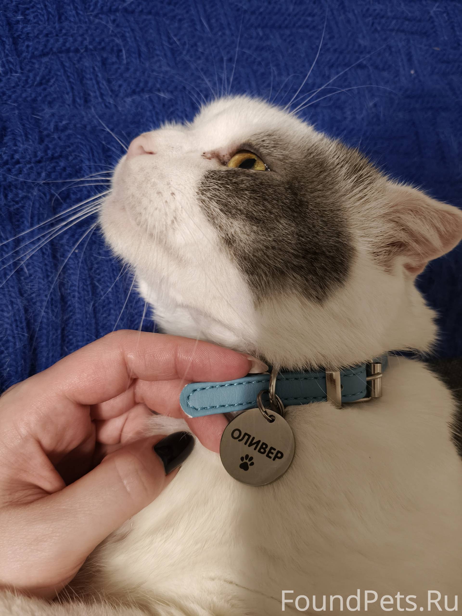 На шее у кота голубой ошейник с адресник...
