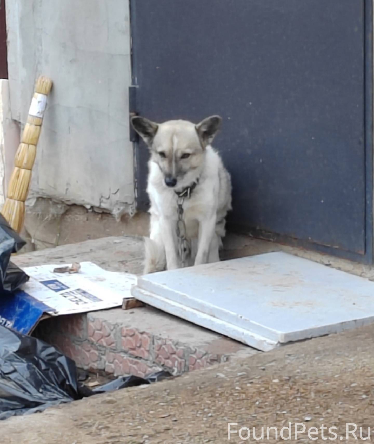Хозяин, срочно, найдись! Весь день сидит собака, в ошейнике, с куском цепочки.