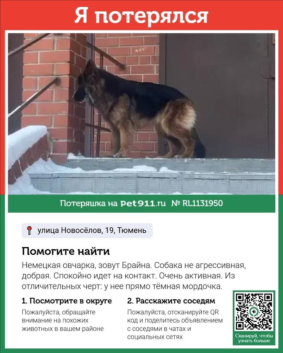 Потерялась собака, район Маяка (убежала с Амурской) Видели сегодня около 16 вечера на Восстание 19к3. Немецкая овчарка, зовут Брайна, на ухе также имеется клеймо. Собака не агрессивная, добрая. Спокой...