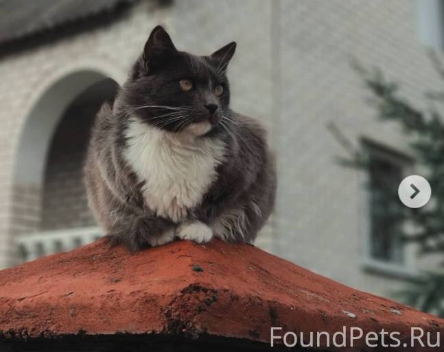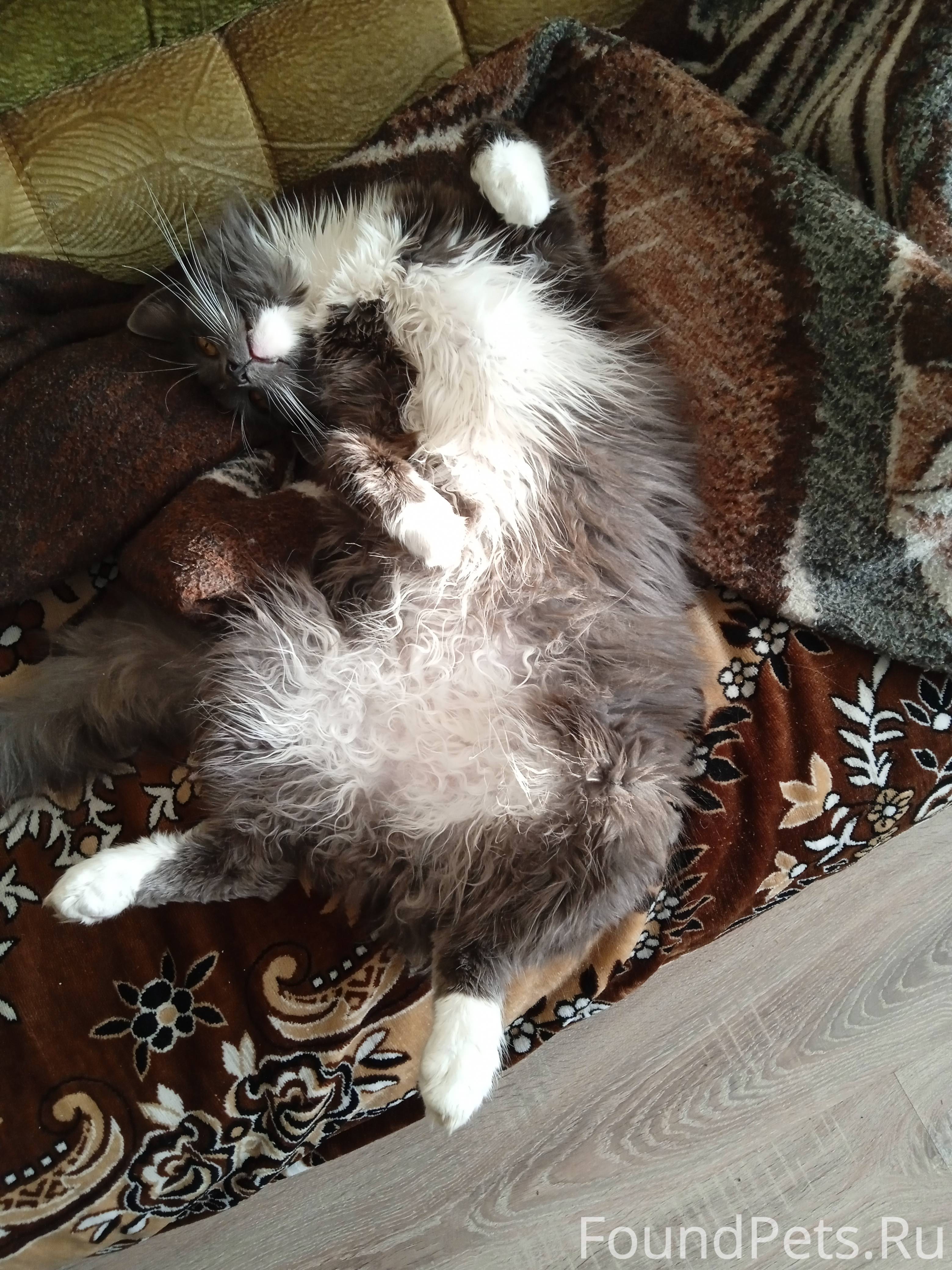 Кот серо-пепельный, задние лапы, живот, шея, бородка - белые. Пушистый.