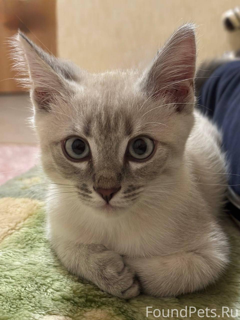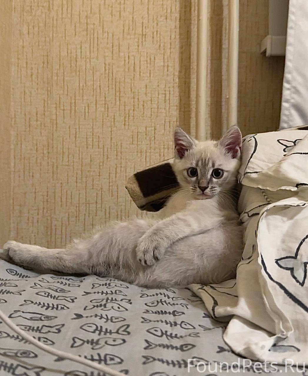 Светлый окрас, уши и хвост черные, котенку 3 месяца, среднего размера, пугливый. на мордочке темная буква "М".