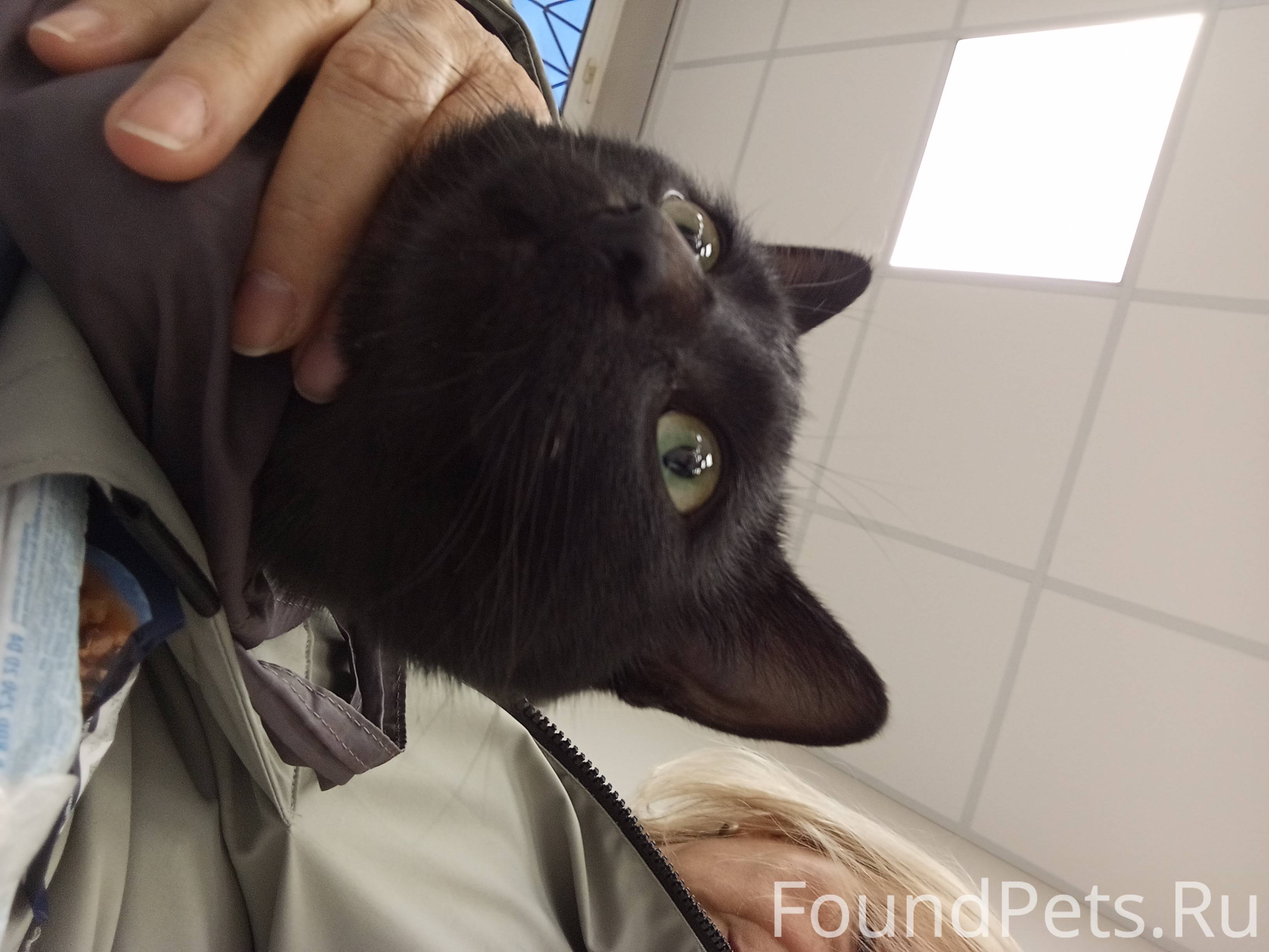 | Приметы | Совершенно черный кот, шерсть мягкая, короткая, возраст около года, в меру пугливый, чистый, явно домашний |
