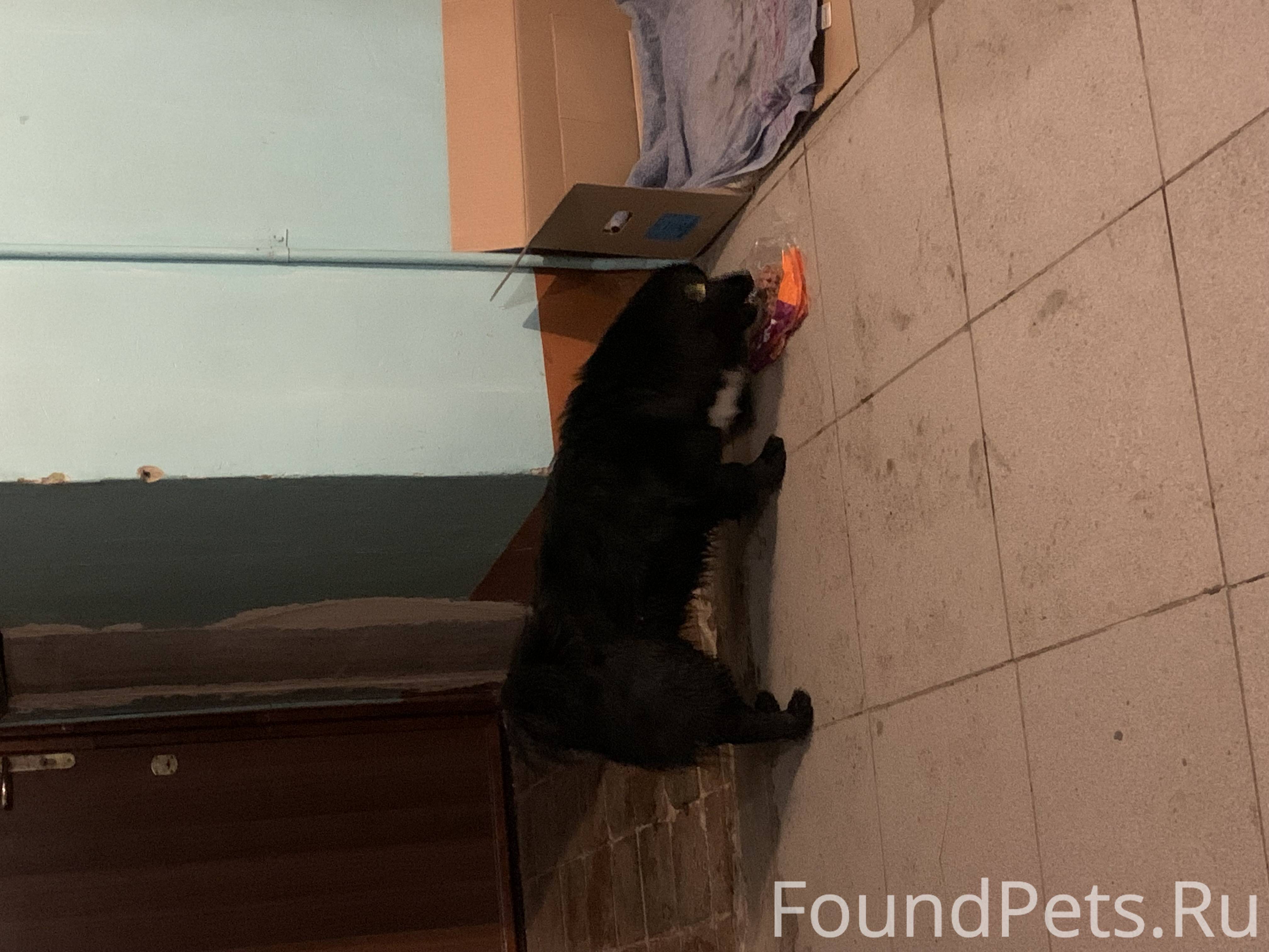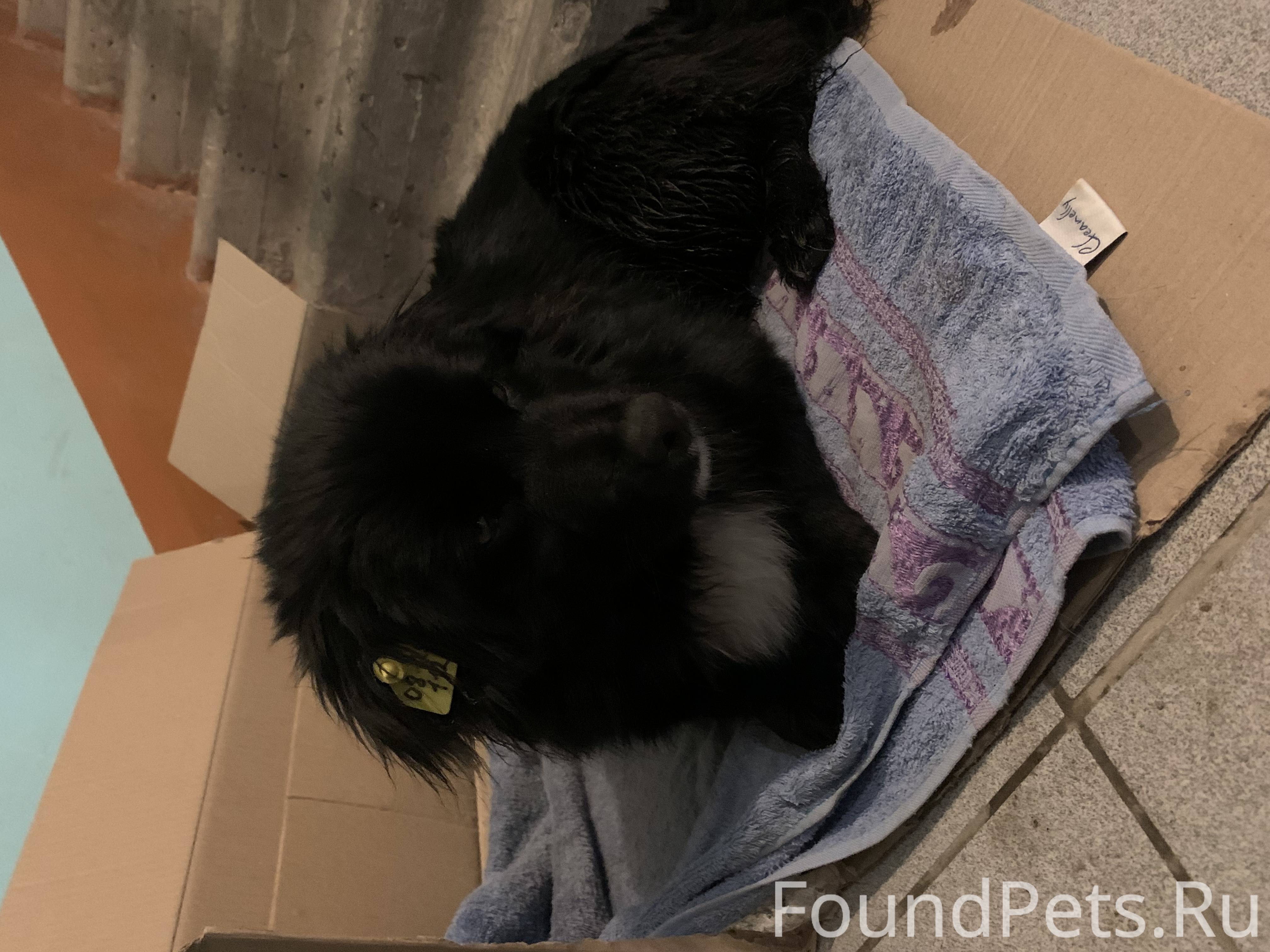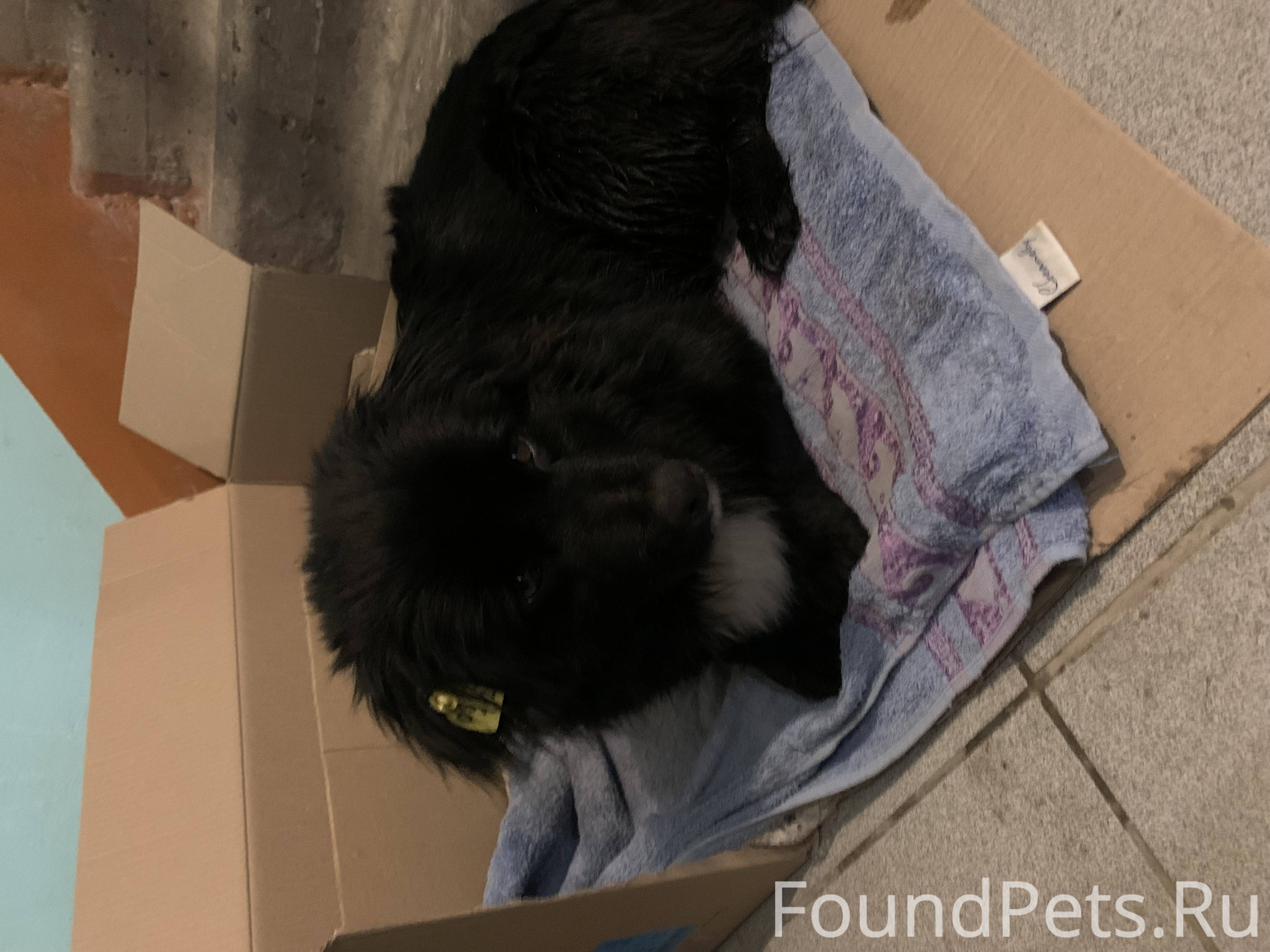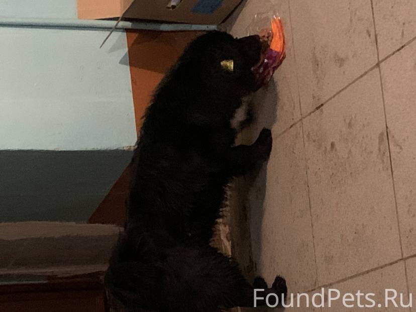 Собака молодая, черная с белым галстуком, на ухе бирка, очень ласковая, не агрессивная