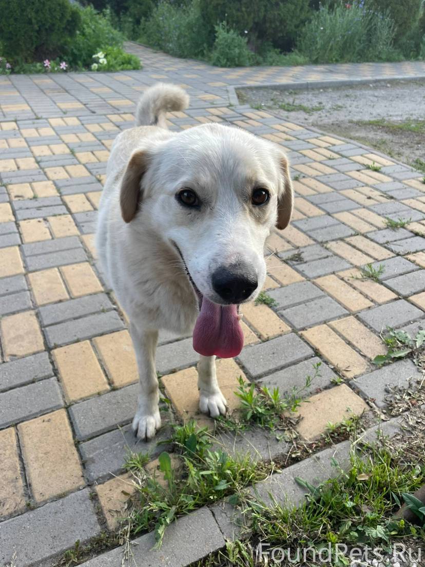 Белый окрас, хромает на заднюю лапу, в ошейнике