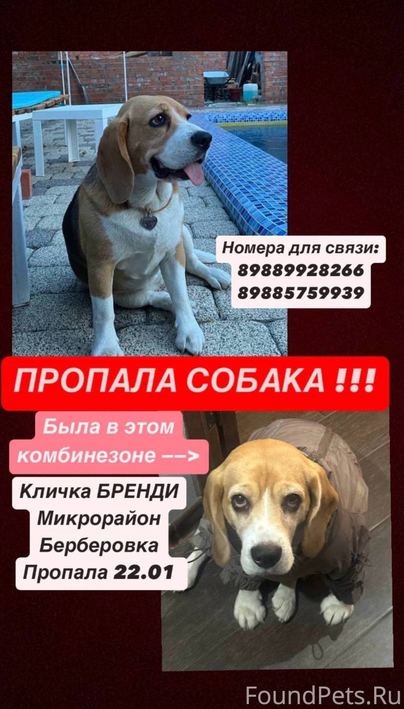 Потерялась собака породы бигл девочка по клички Бренди, Ростов-на-дону район Берберовки ( старый автовокзал ) рыжий-черный-белый окрас, была в фиолетовом комбинезоне как на втором фото и в шлейке, имеется большой шрам вдоль всего живота