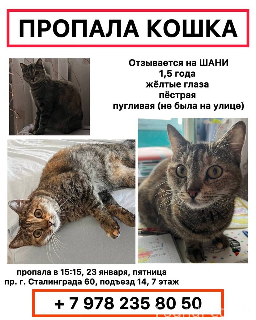 Потерялась 23 января (пятница) в 15 часов дня по адресу: проспект г. Сталинграда 60, 14 подъезд, 7 этаж.