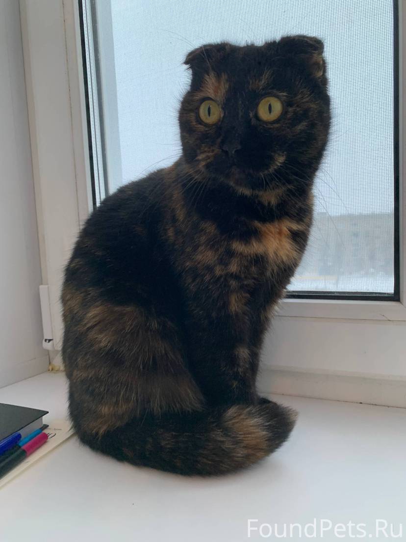 Была найдена мной на лестничной площадке. Кошка точно домашняя, приучена к лотку, чистая. Породистая: шотландская вислоухая, черепаховый окрас. Очень ласковая и разговорчивая. Хотела бы оставить у себя, но не могу по причине аллергии.