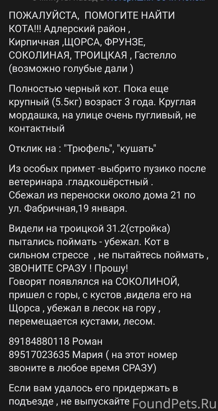 Пропал Кот! Адлерский район