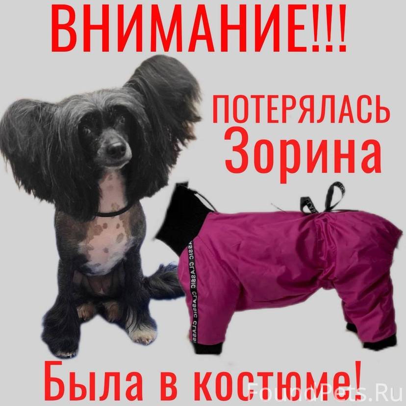 Кличка Зорина, порода Китайская хохлатая, возраст 8,5 лет. Людей не боится, не агрессивная абсолютно. Одета в сиреневый комбинезон. Ошейника, поводка не было! Есть чип! Значительное вознаграждение!